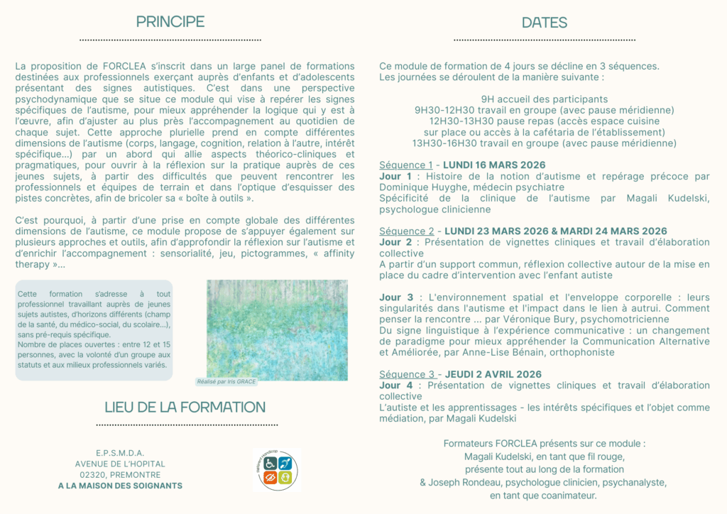 La proposition de FORCLEA s’inscrit dans un large panel de formations destinées aux professionnels exerçant auprès d’enfants et d’adolescents présentant des signes autistiques. C’est dans une perspective psychodynamique que se situe ce module qui vise à repérer les signes spécifiques de l’autisme, pour mieux appréhender la logique qui y est à l’œuvre, afin d’ajuster au plus près l’accompagnement au quotidien de chaque sujet. Cette approche plurielle prend en compte différentes dimensions de l’autisme (corps, langage, cognition, relation à l’autre, intérêt spécifique…) par un abord qui allie aspects théorico-cliniques et pragmatiques, pour ouvrir à la réflexion sur la pratique auprès de ces jeunes sujets, à partir des difficultés que peuvent rencontrer les équipes du terrain et dans l’optique d’esquisser des pistes concrètes, pour que chacun puisse se bricoler sa « boîte à outils ».